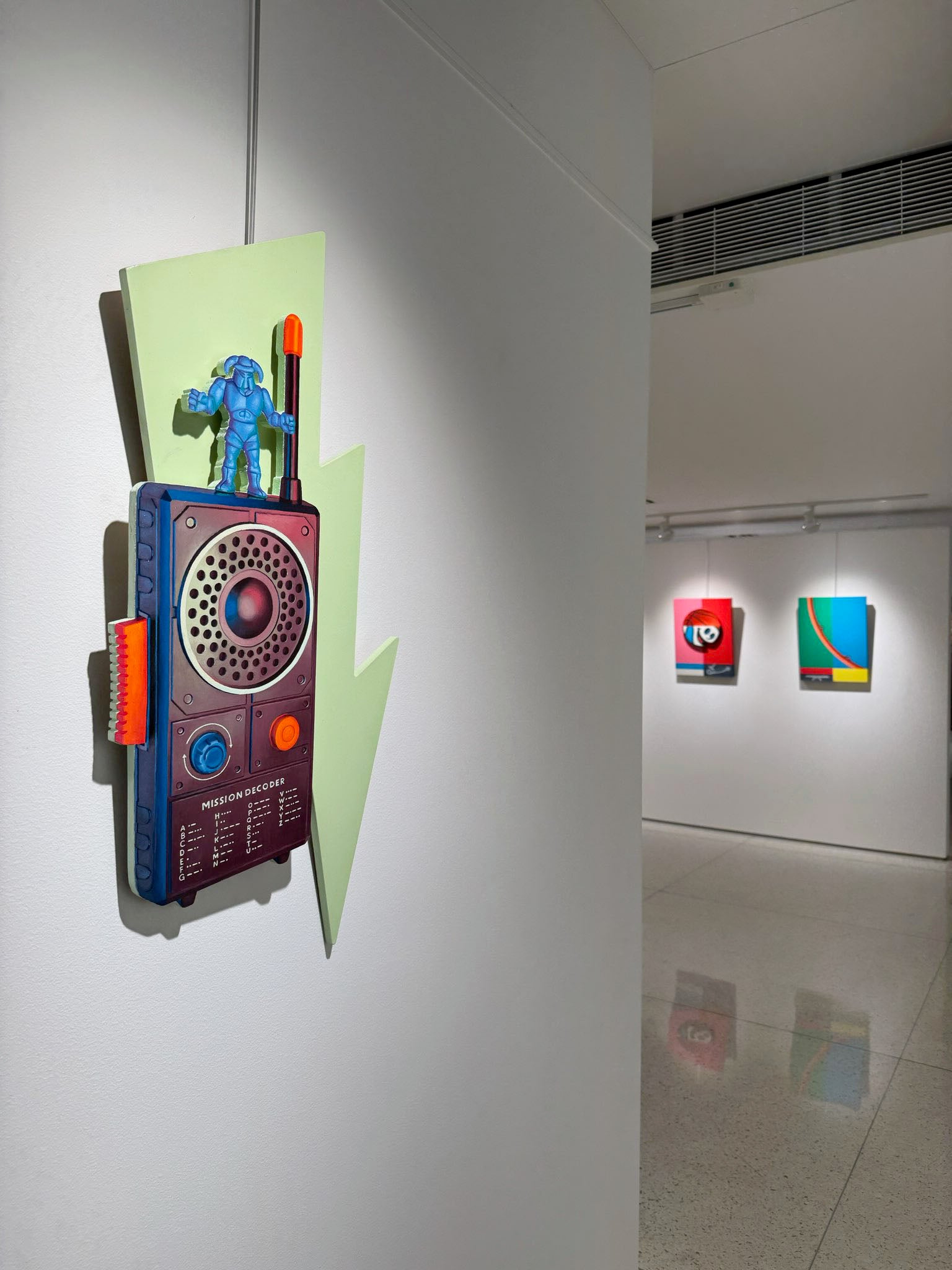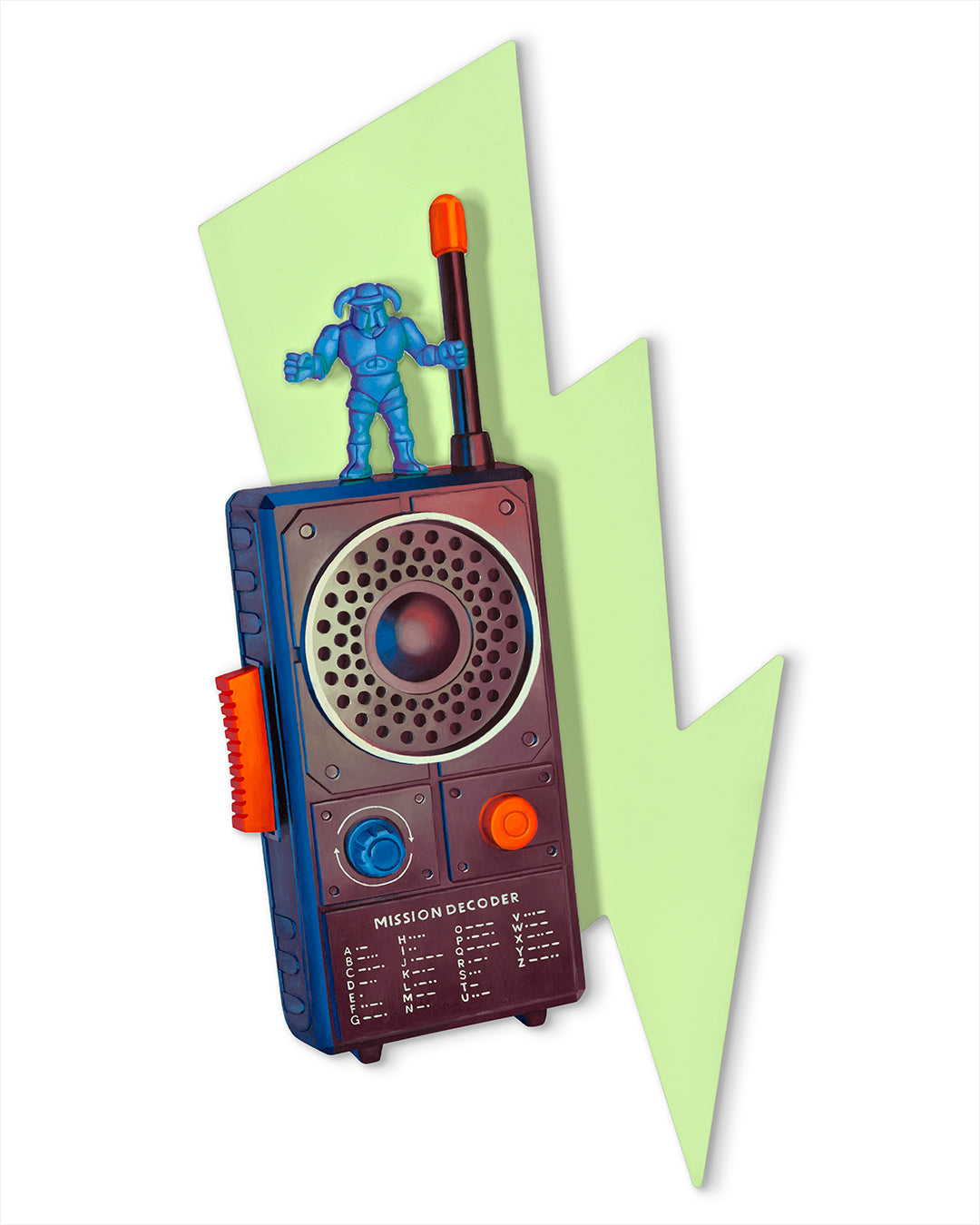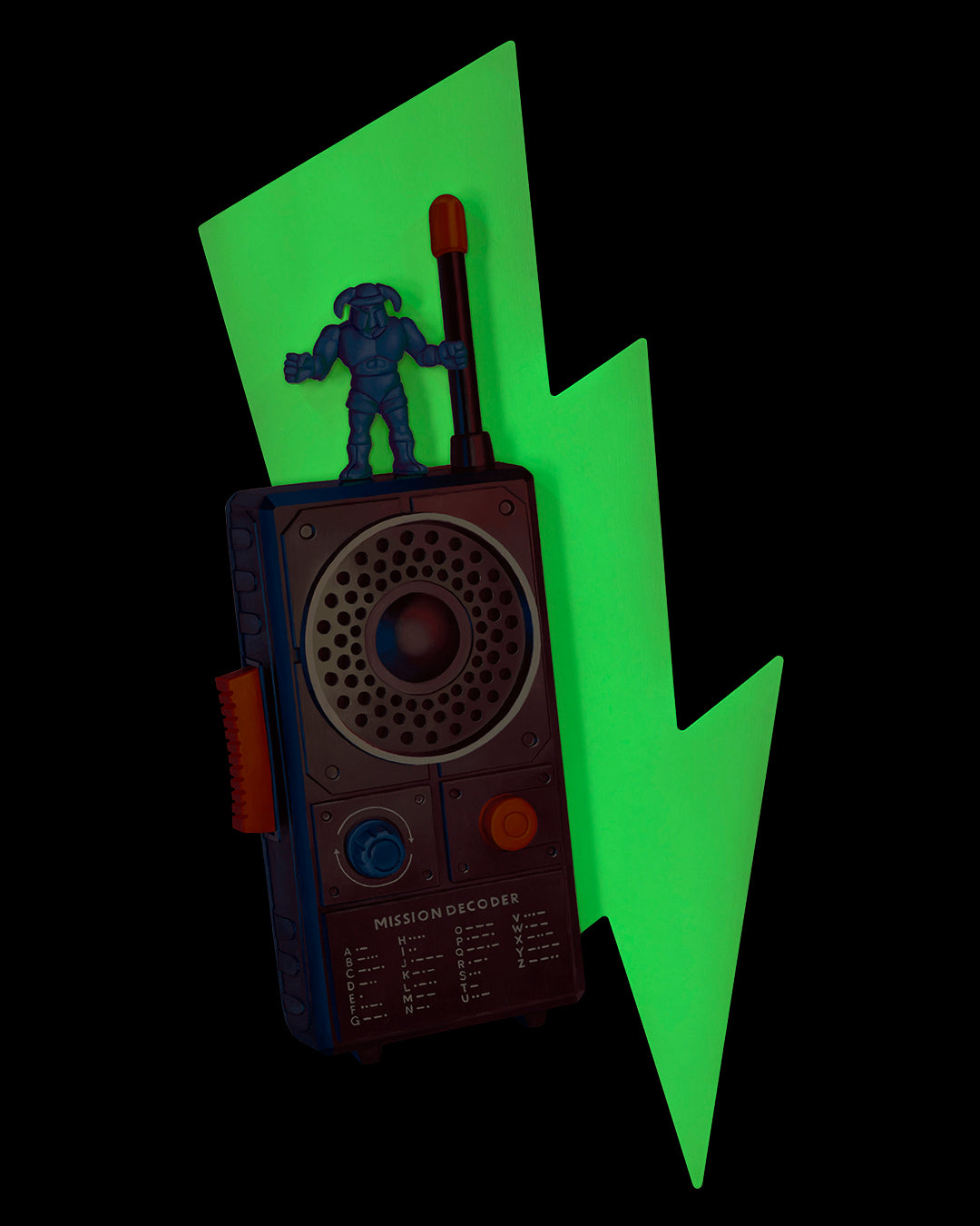 The concept for the TRANSMISSION Series paintings started in 2022. This piece begins the dialog by introducing a communication device. This was also the beginning exploration for the journey of “play” and would become the catalyst piece for the body of work and exhibition I call Monuments of Play. I think of the walkie talkie as receiving transmissions from my 6 year self. The context of those transmissions are basically "hey if we can make anything we want lets bring some of the stuff that lights us up!" That painting contains a cryptic message written down the side of the painting that relates to these transmissions and the ability of the lightning bolt to glow-in-the-dark. The cypher for decoding the message is contained on the body of the walkie-talkie in the form of Morse Code.