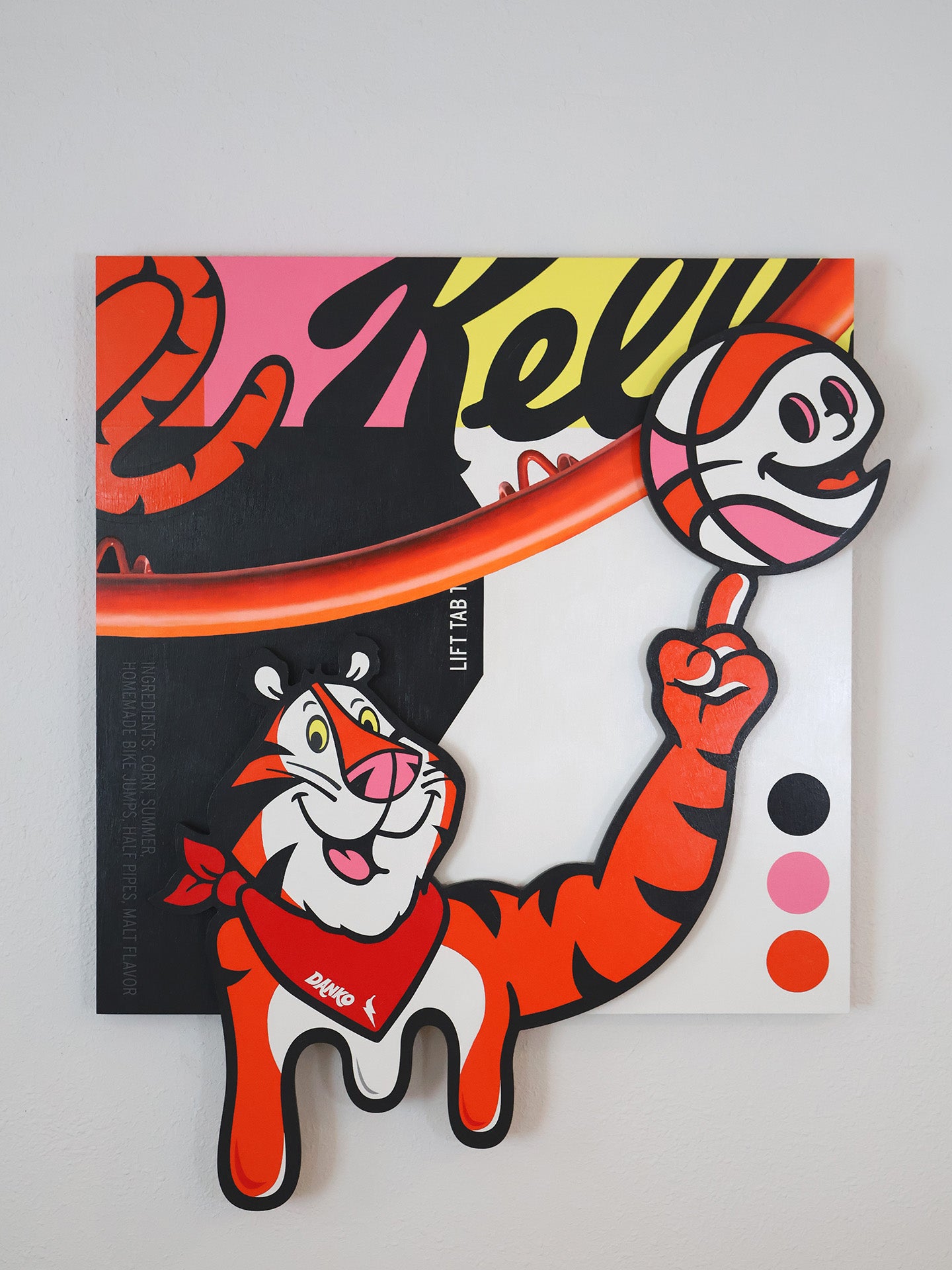 On view at KP Projects Gallery from August 2nd - August 30th as part of the group show Spheres of Influence. Hello Tiger is an open letter to the blend of influences in my art, with co-authoring by my 6 year old self. The result, a remix born from Ellsworth Kelly’s minimalist rigor as reimagined through the most optimistic of mass culture. Drawing from Kelly’s Tiger painting, I lifted only the color fields and rebuilt the composition through the lens of my own visual vocabulary—one shaped by Saturday mornings, cereal boxes, and the energy of sport. Tony the Tiger and a spinning basketball cut through Kelly’s modernist grid, collapsing the boundary between canonical abstraction and the commercial imagery that I play with most frequently in my practice.