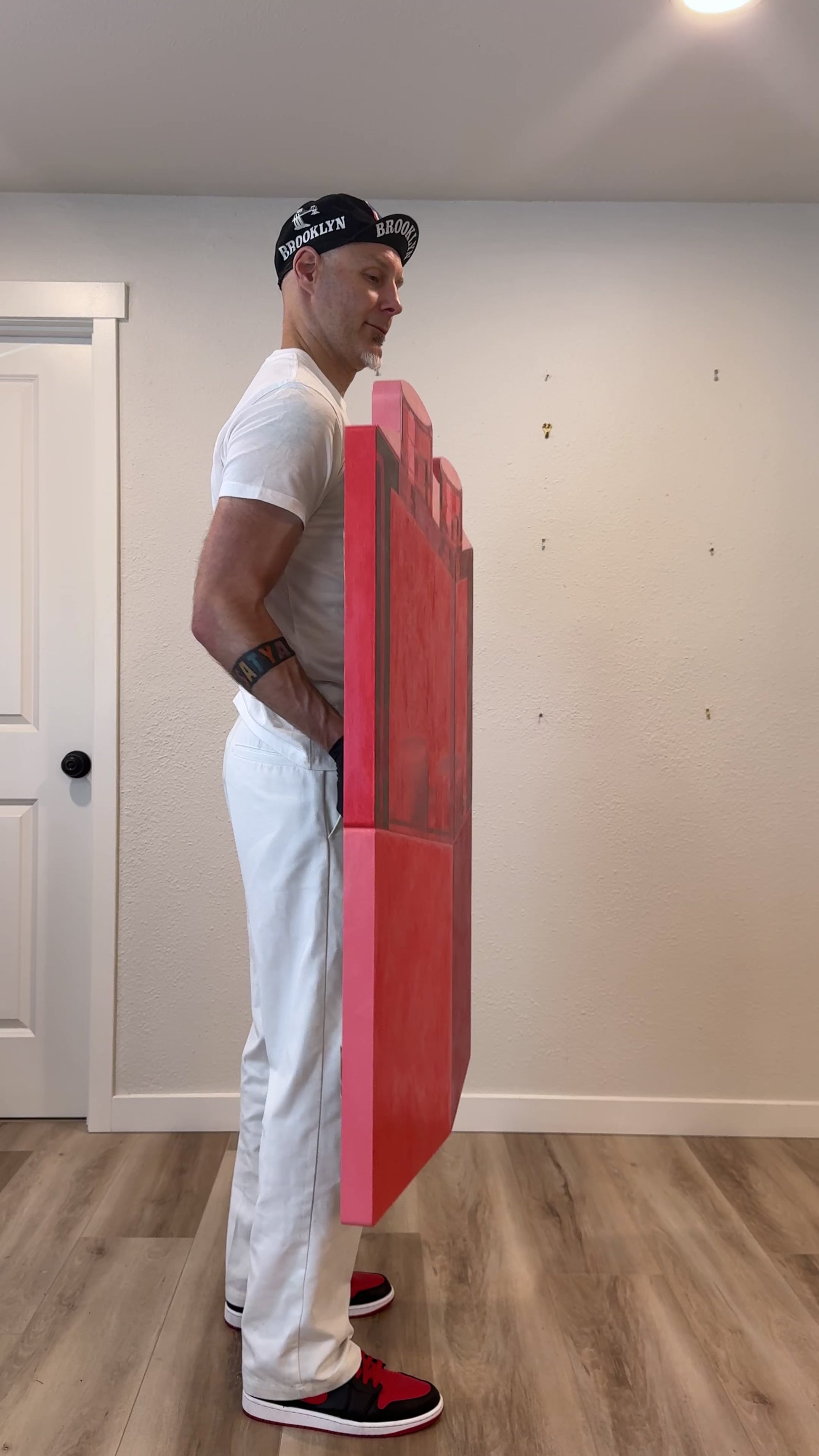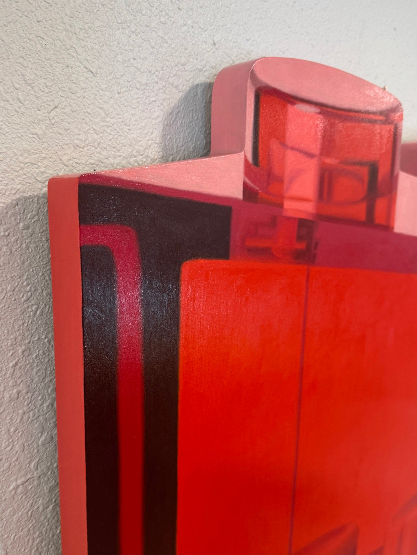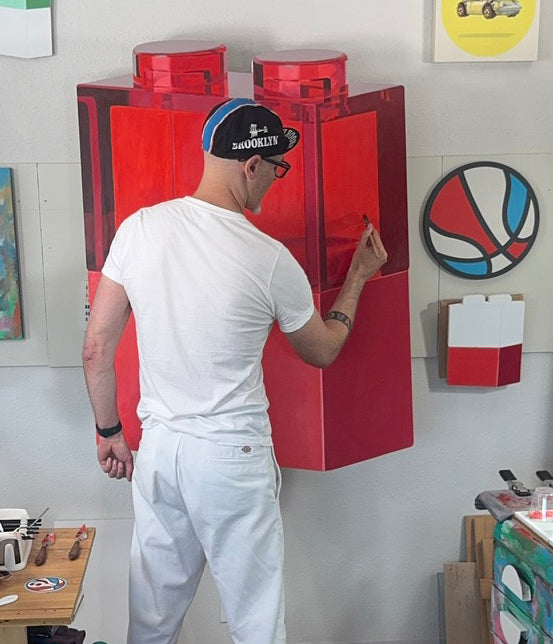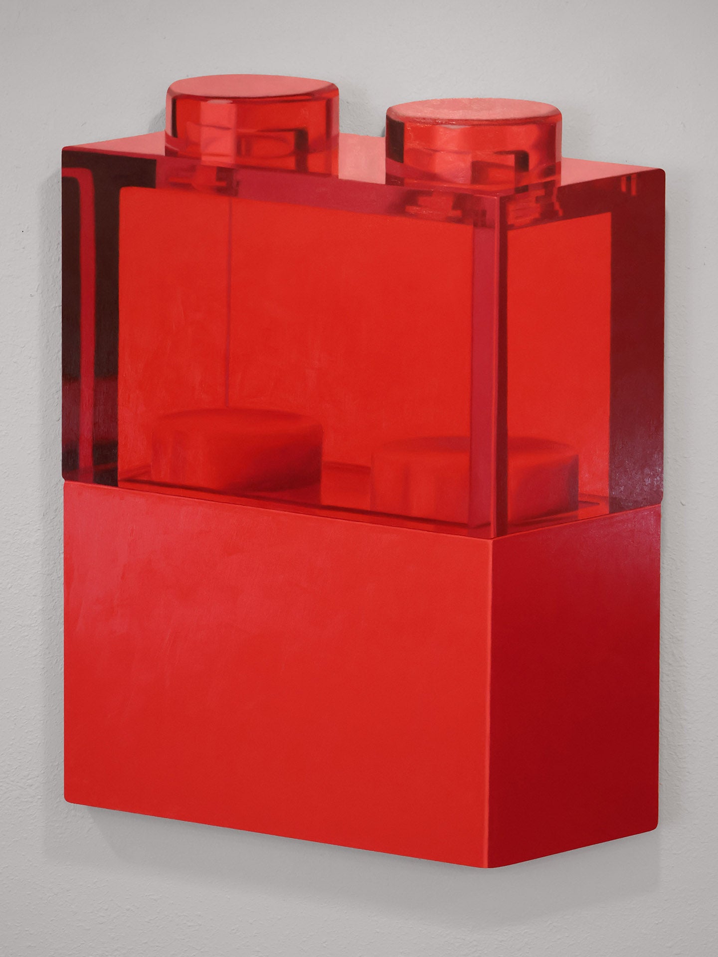 This is the second of the Infinity Bricks. The original clear and black Infinity Brick was part of my show “Monuments of Play” at the SAM Gallery at the Seattle Art Museum. This body of work, which I continue to build on, explores iconic cultural artifacts of “play”, and the importance of play throughout life. With these big brick paintings the solid lower brick, serves as a visual anchor to the present, while the upper translucent brick, represents a lens through which memories and past experiences pass through and continue to inform our present day lives.