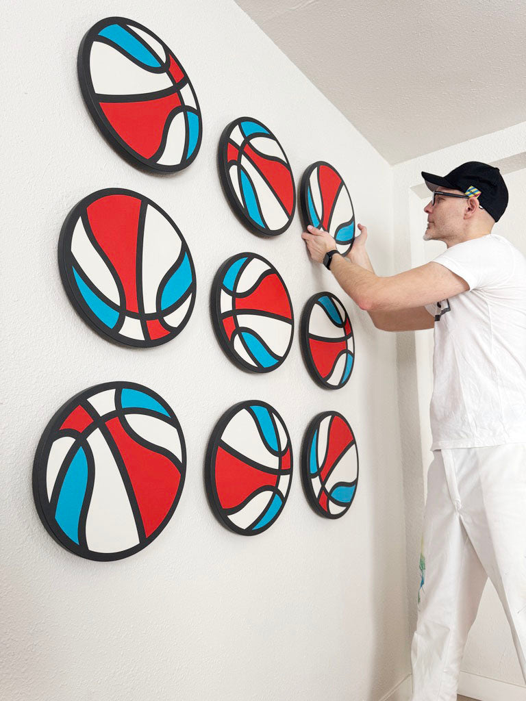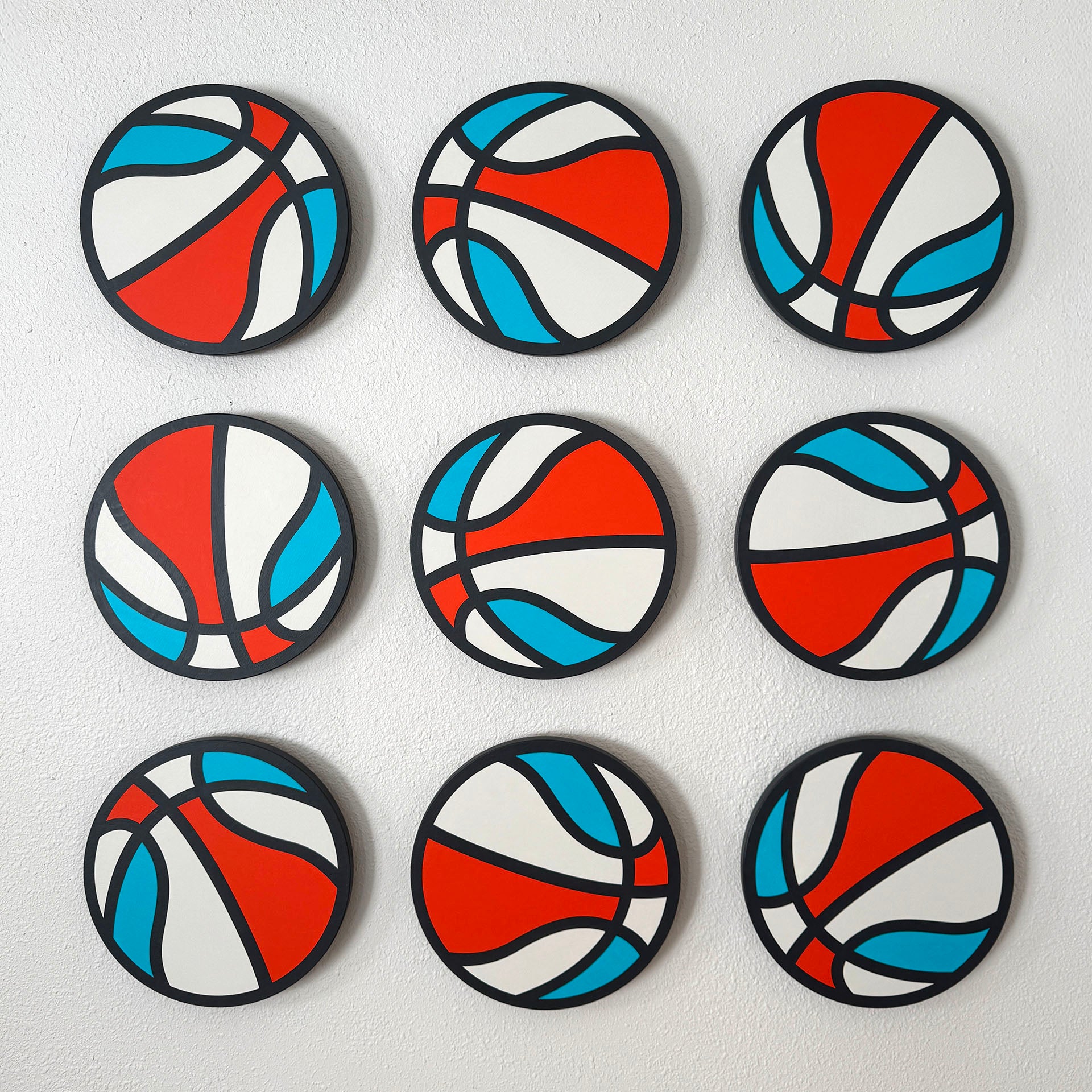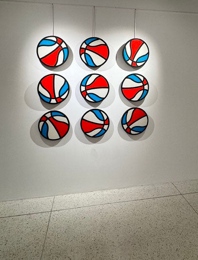 This nine panel 48"x48" acrylic on wood painting recalls the poetry of a ball in midair, spinning in play. Each basketball panel is offset with a back mounted base, giving the illusion that it’s floating off the wall.
