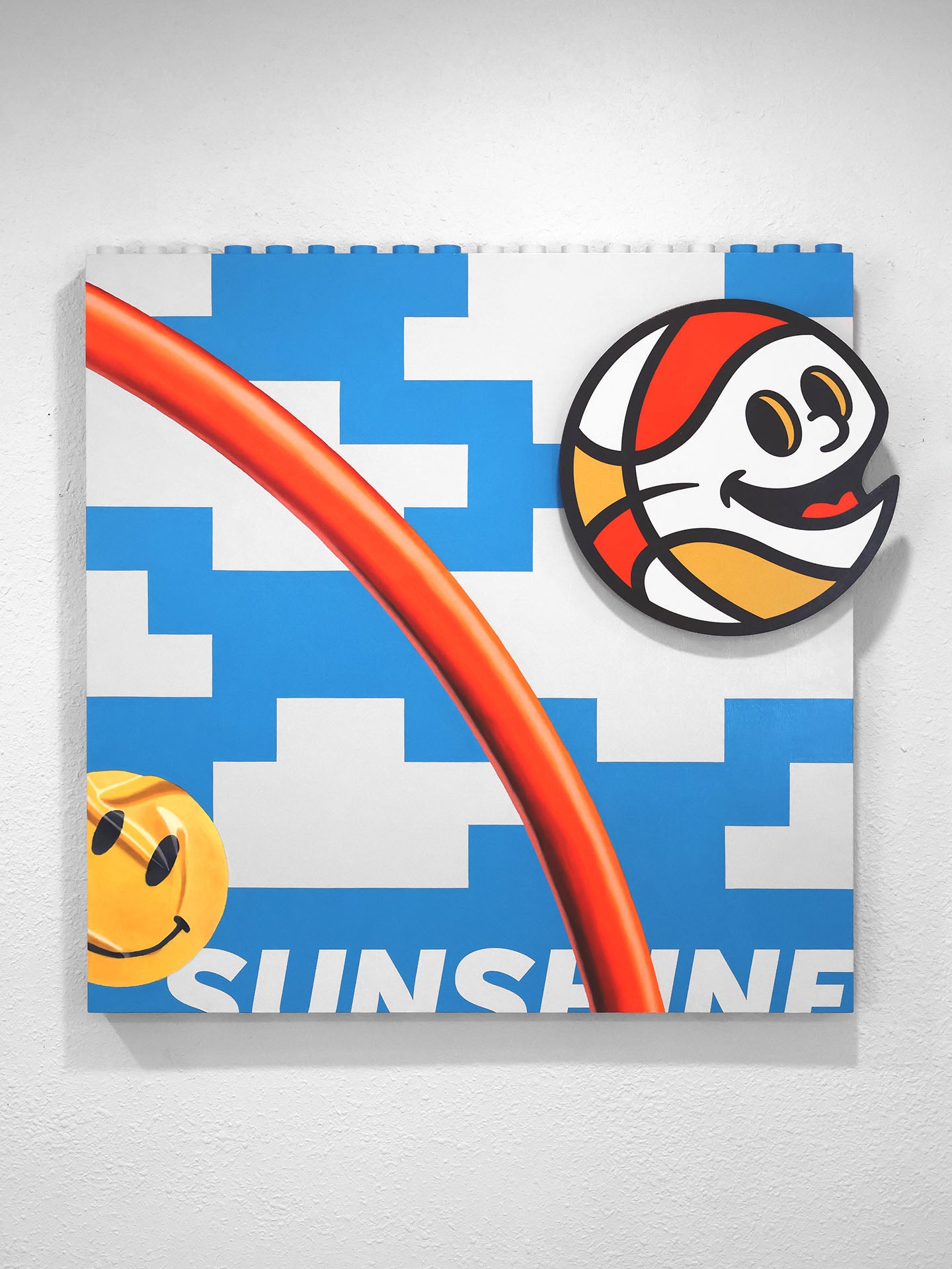 Zero, my character based on a basketball, is a recurring mascot and instigator of adventure in my work. In Sunshine, he spins with a grin towards the hoop, which is rendered in realism and anchors the piece in a kind of surreal clarity. The smiley face sticker—creased, shiny, familiar—is a universal call to remember to never take anything too seriously.