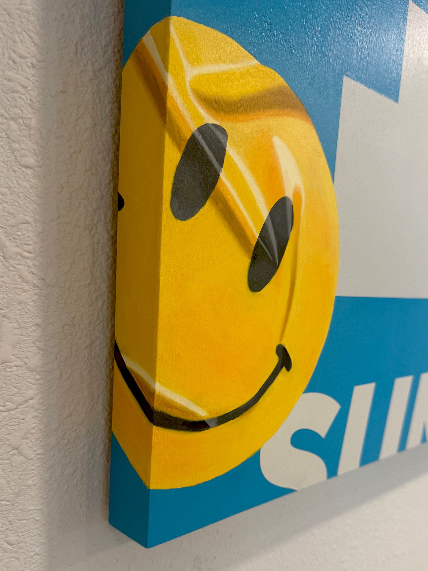With Sunshine, the stacked, blocky clouds hint at LEGO structures—a nod to impermanence and a kind of modular optimism. The top is finished with brightly painted wooden knobs that mimic LEGO bricks and turn the geometric sky into a tangible surface that bridges painting with sculpture. The palette is intentionally vivid. Crisp blue sky, bright white clouds, cheerful oranges, and warm yellows remind us that no matter how dark or “overcast” the sky appears to be, the sun is always shining above the clouds.