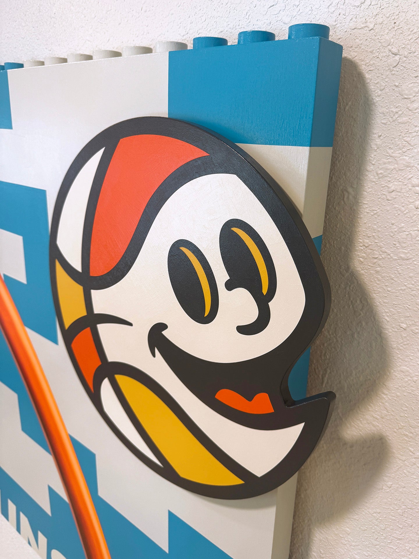 Materials: Oil & acrylic on wood panel with cutout attachments and sculptural toy brick knobs.