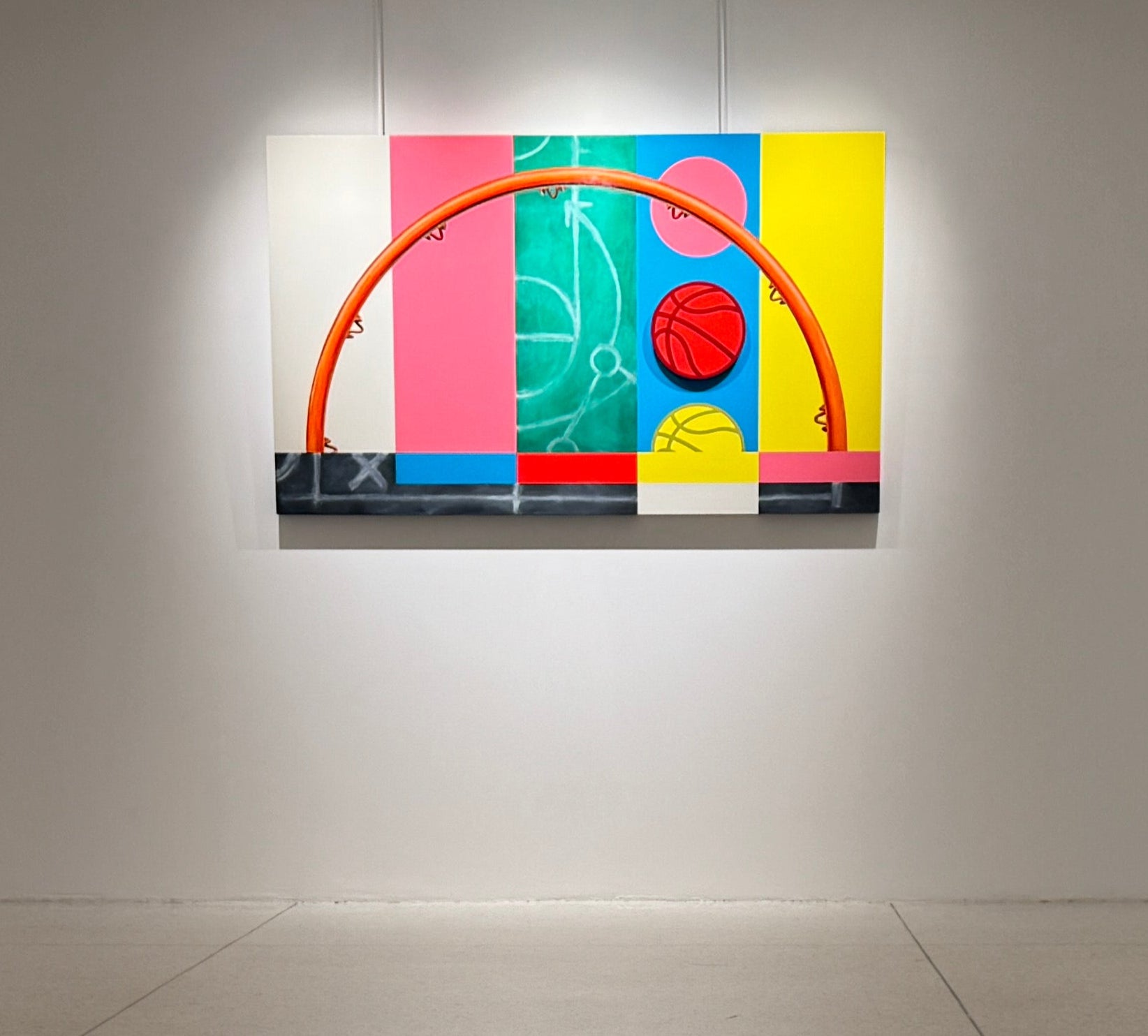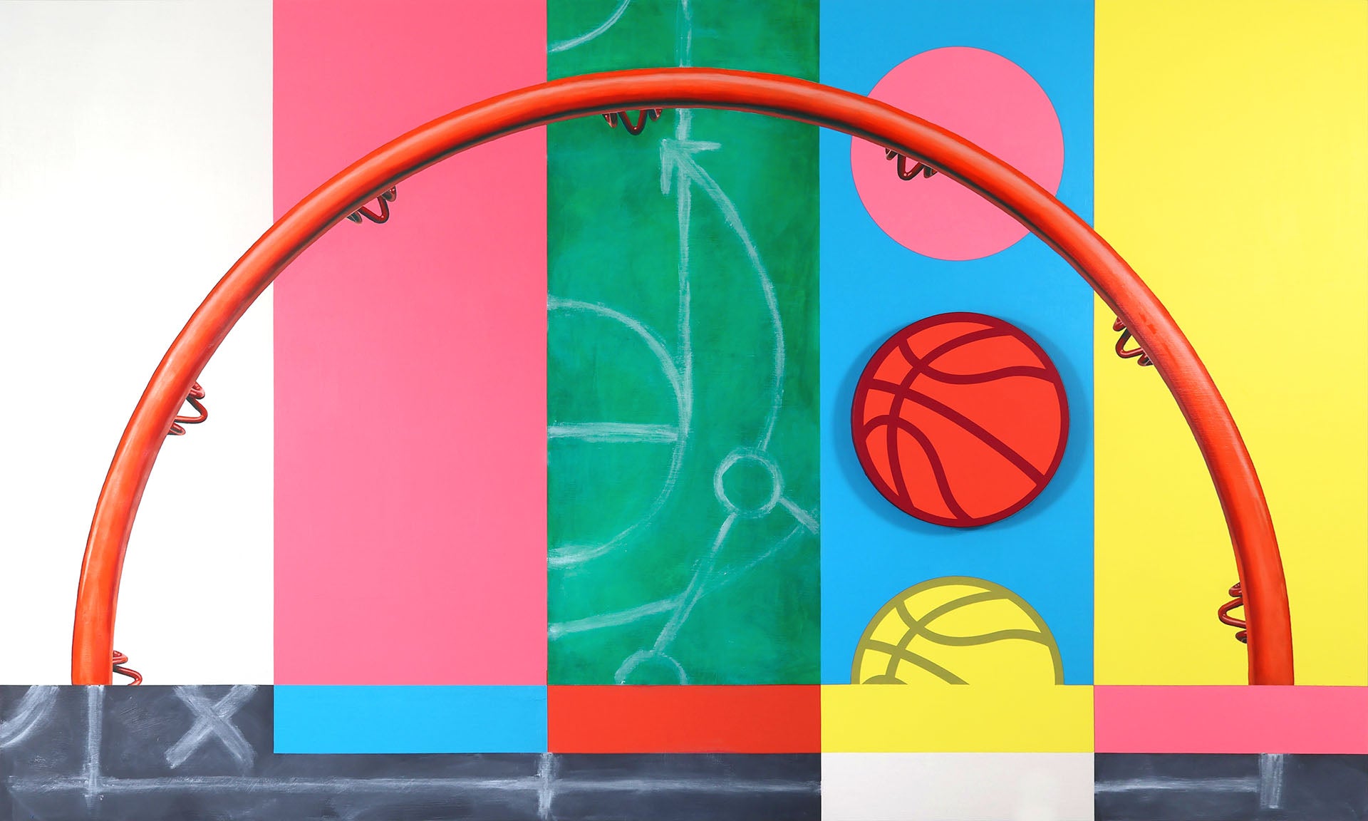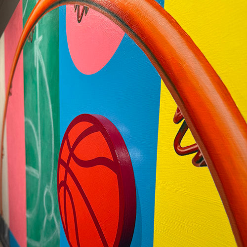 The TRANSMISSION paintings are rooted in the backdrop of the iconic “test signal” that would run as the final transmission of late night TV. It was a reset of the day’s programming and a placeholder of content yet to come. It is the canvas of possibility, an ether of the unknown. Play before “keeping score” is just that, a place to explore, dream and refine. This is a time before seriousness blunts the fine edge of enjoyment and inspiration.