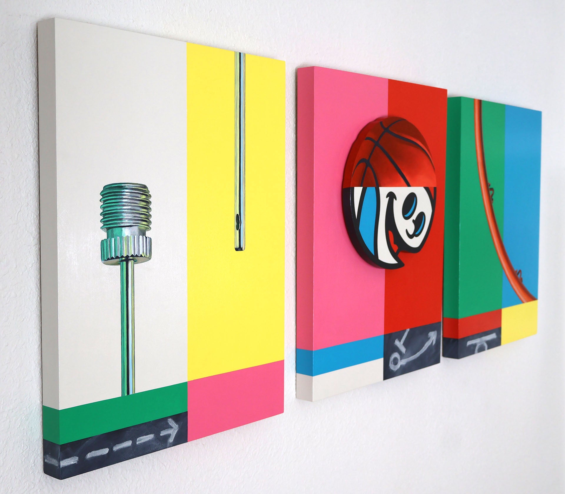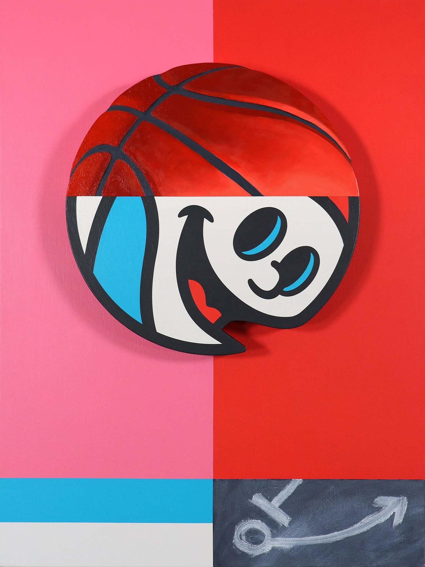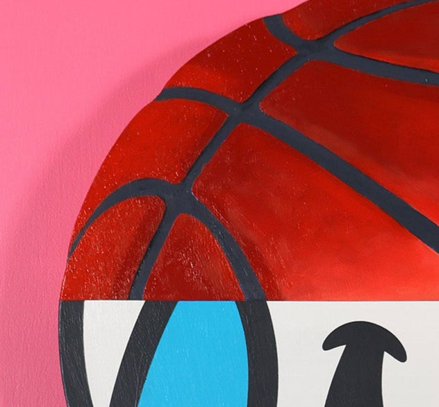 These smaller TRANSMISSION paintings, when grouped together, form a “test signal” graphic. Each contains preliminary artifacts of “play”. The metal ball needle, the ball and anticipation of excitement as anthropomorphized by the basketball character ZERO, and the large detail of the basketball hoop come together to prime us for game play. There is no score card or team affiliation, just the purity of action and experimentation.