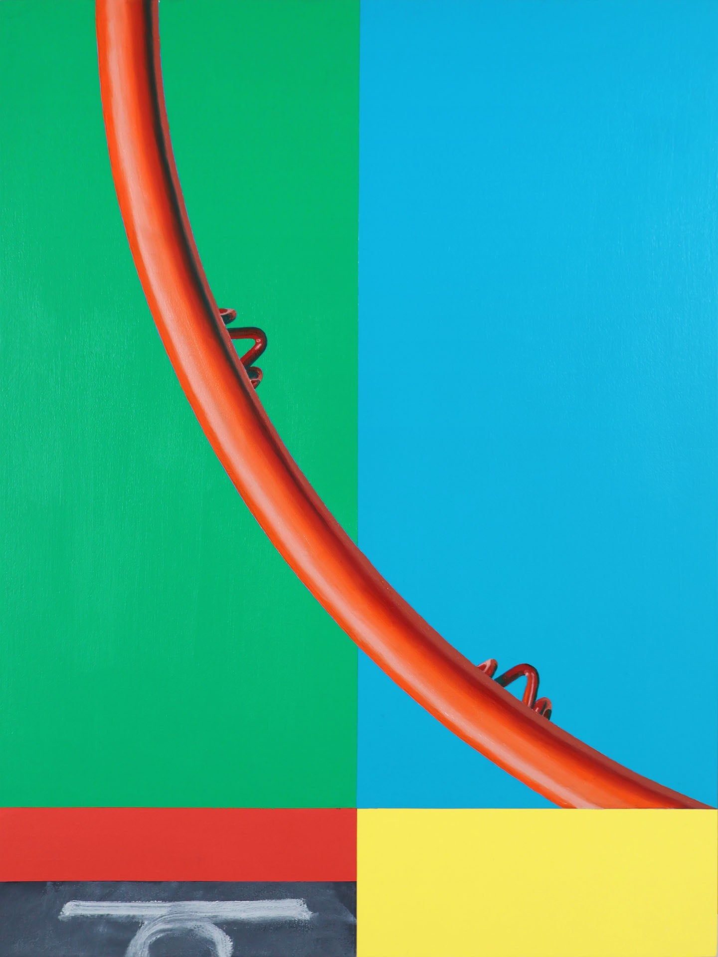 These smaller TRANSMISSION paintings, when grouped together, form a “test signal” graphic. Each contains preliminary artifacts of “play”. The metal ball needle, the ball and anticipation of excitement as anthropomorphized by the basketball character ZERO, and the large detail of the basketball hoop come together to prime us for game play. There is no score card or team affiliation, just the purity of action and experimentation.