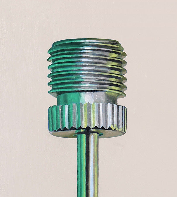 These smaller TRANSMISSION paintings, when grouped together, form a “test signal” graphic. Each contains preliminary artifacts of “play”. The metal ball needle, the ball and anticipation of excitement as anthropomorphized by the basketball character ZERO, and the large detail of the basketball hoop come together to prime us for game play. There is no score card or team affiliation, just the purity of action and experimentation.